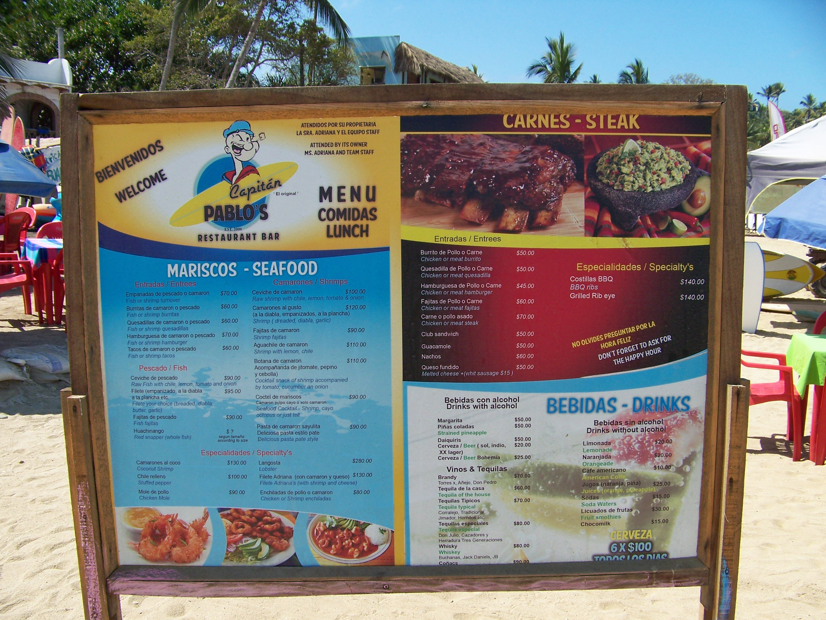 Sayulita 2012 17 Tuesday Apr 2012 Original size at 2832 × 2128 ≈ Comments Off on Pablos_Menu Captain Pablo’s menu. Like Loading...